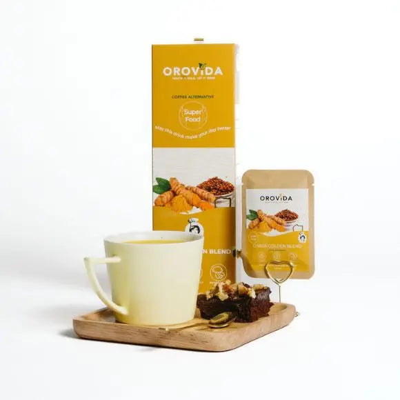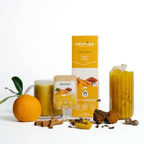 OroVida Blends' Chaga Golden Blend is a premium beverage mix that combines organic turmeric with chaga mushroom extract, collagen, and a variety of natural botanicals. It is designed to provide a delicious and healthful drink that can be enjoyed hot or cold.