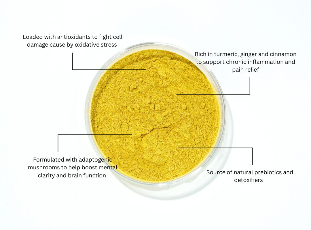 Organic Turmeric , Organic Chaga Mushroom Extract, Organic MCT Oil, Collagen Peptides Protein, L-Theanine, Orange, Ashwagandha, Black Pepper, Fennel, Ginger, Ceylon Cinnamon, Nutmeg, Cloves, Monk Fruit.